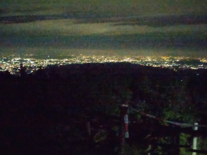 夜明け前の日出山の山頂、五日市市街の美しい夜景を見る。